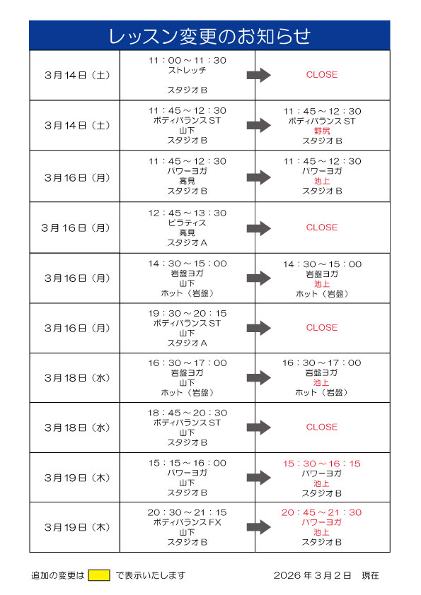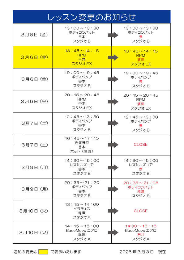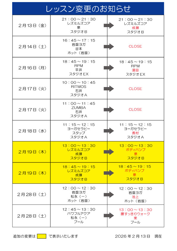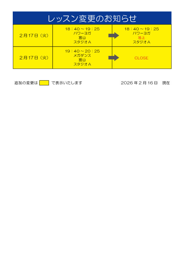 当日の変更はお電話にてお問い合わせ頂くか、館内掲示もしくはLINEでの配信をご確認ください。