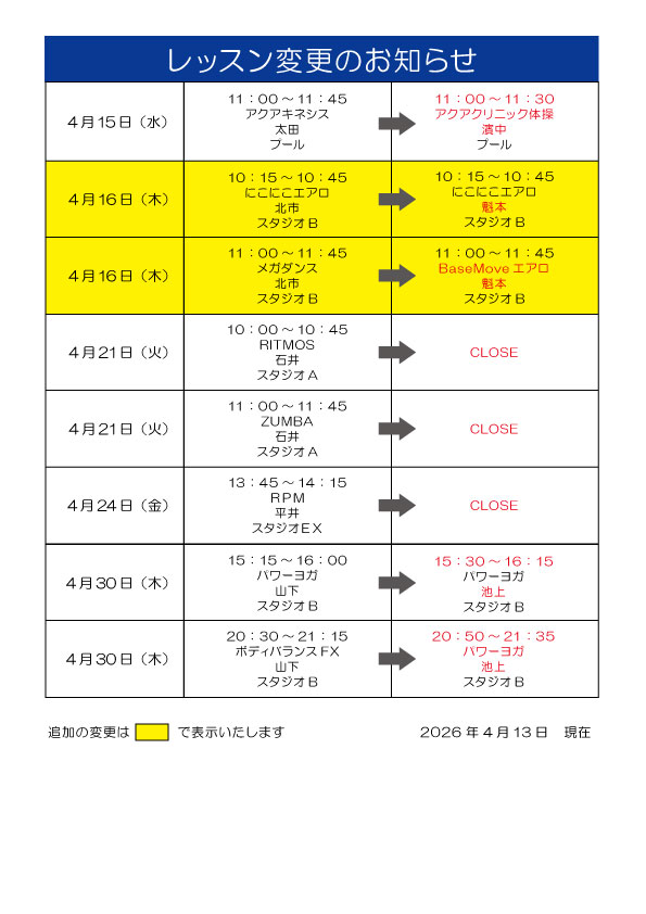 レッスン変更のお知らせ【3/3】